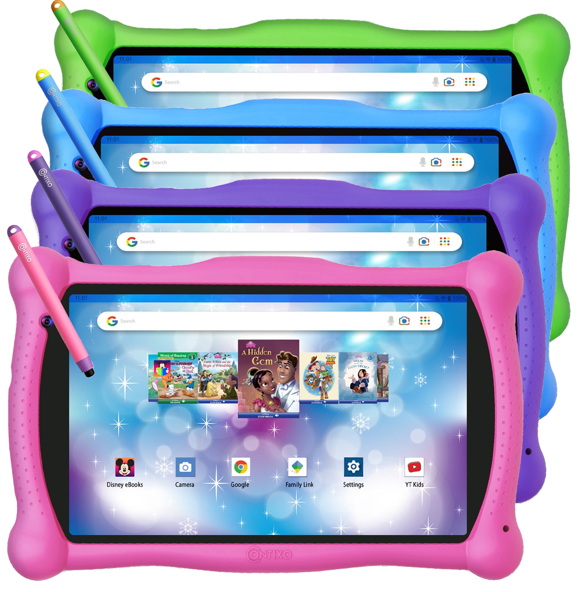 Meet the Contixo 7- V10 Kids Bluetooth 32GB Tablet - an exceptional learning and entertainment tool for children. With its 7-inch HD display, dual cameras, Android 11, and a quad-core processor, this tablet offers a dynamic learning experience. It comes with parental controls, a kid-proof case, and pre-applied screen protectors for added peace of mind. In four fun colors, it's both durable and stylish. Plus, it includes a stylus and, as a special treat, 50 Disney Digital Audio Books, making it an educational and entertaining companion for kids.