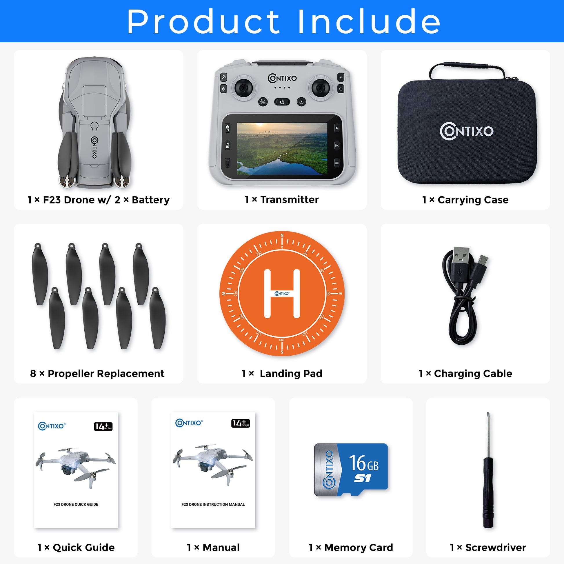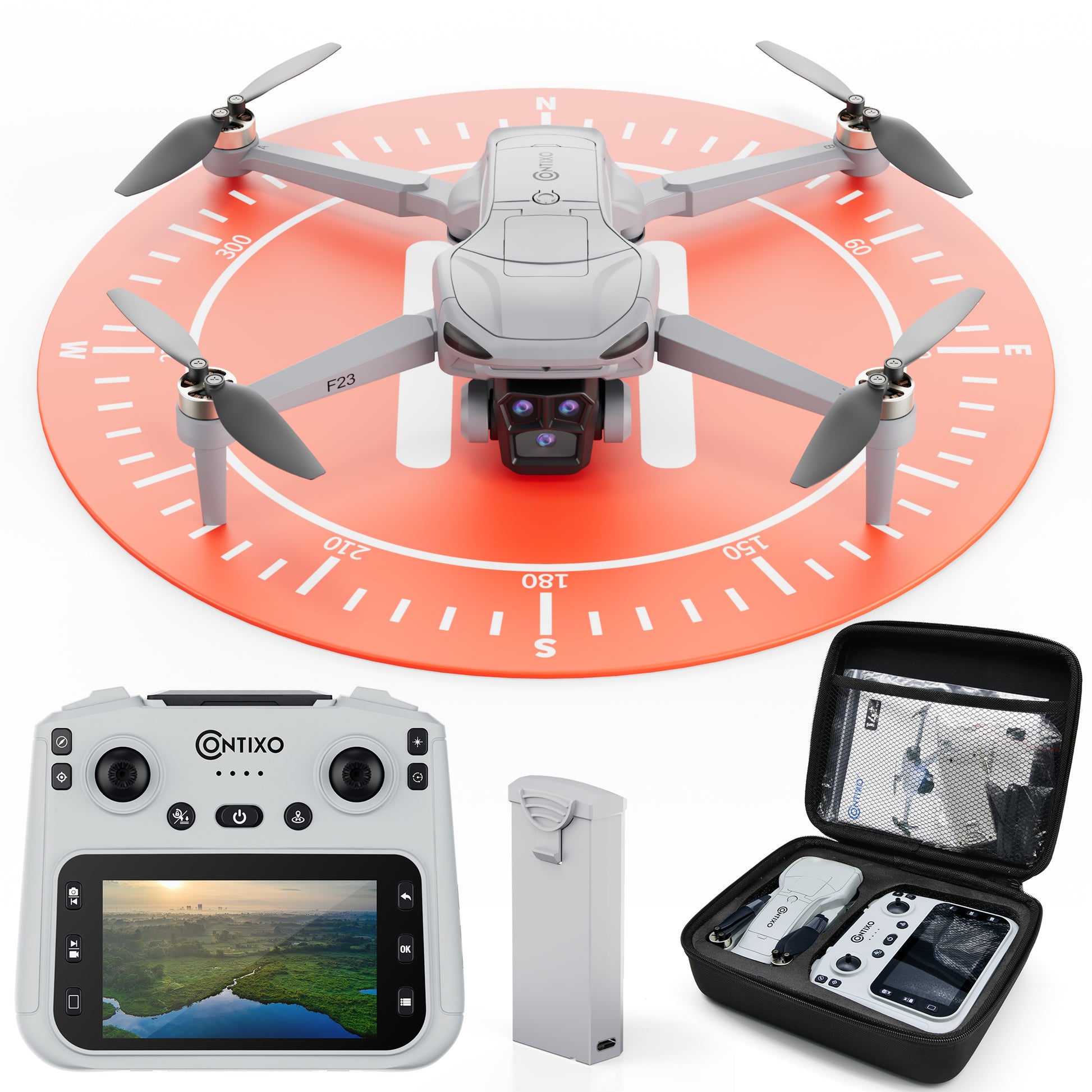 Experience next-level flight with the Contixo F23 drone with camera-built with precision GPS and optical flow for smooth, reliable control. This mini drone features a built-" screen so you can view real-time footage instantly, with no smartphone required. With smart functions like follow-me, circle flying, and route planning, you-ll capture professional-looking footage from up to 600 feet away. Each battery provides up to 23 minutes of flight, and with two included, you can fly longer and explore farther. Ideal for adults and kids aged 8-12, this camera drone consists of a 16GB memory card, a drone landing pad, and a portable carrying case-perfect for travel or as a gift. And when you connect a phone, you unlock even more FPV drone features and controls.